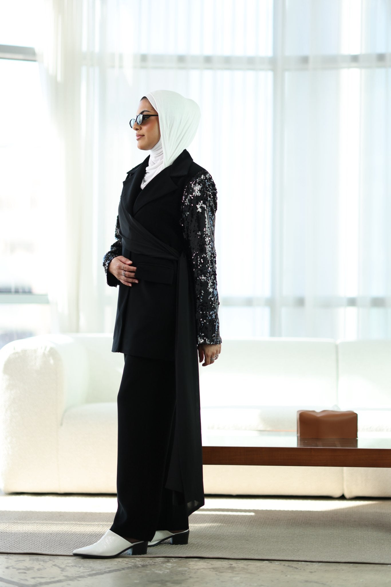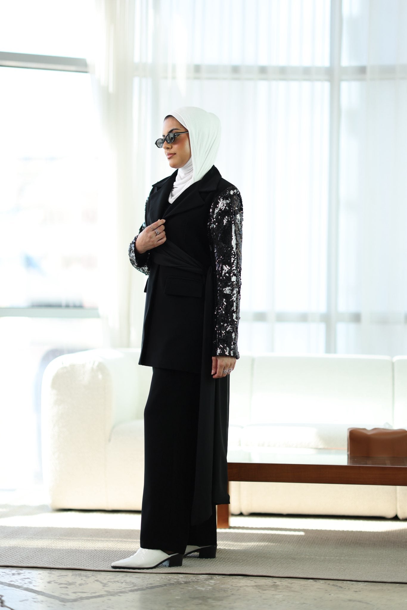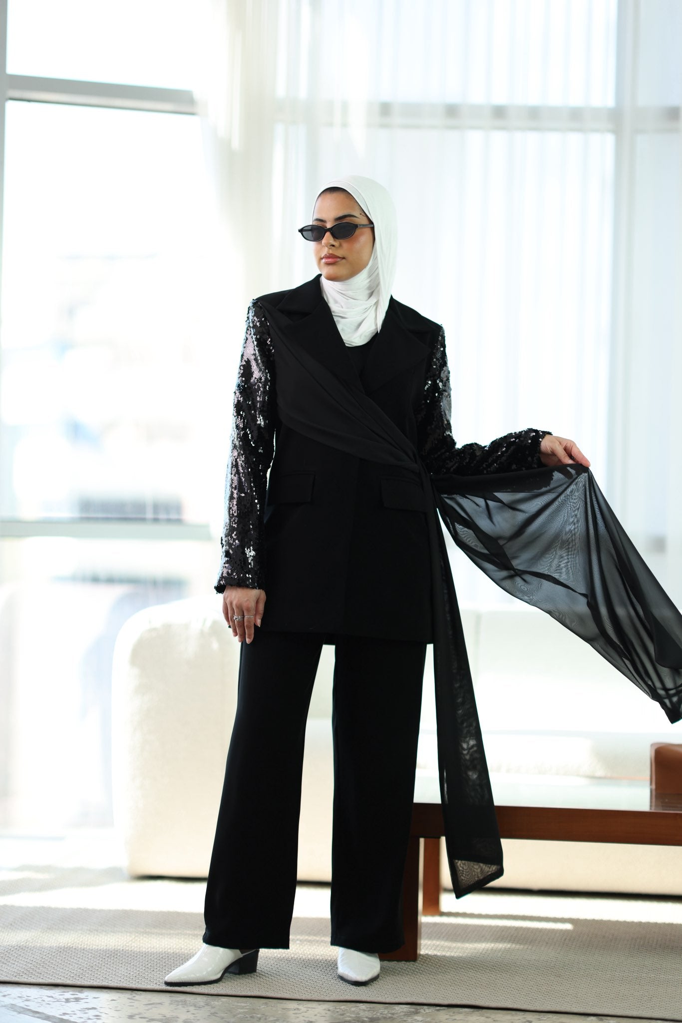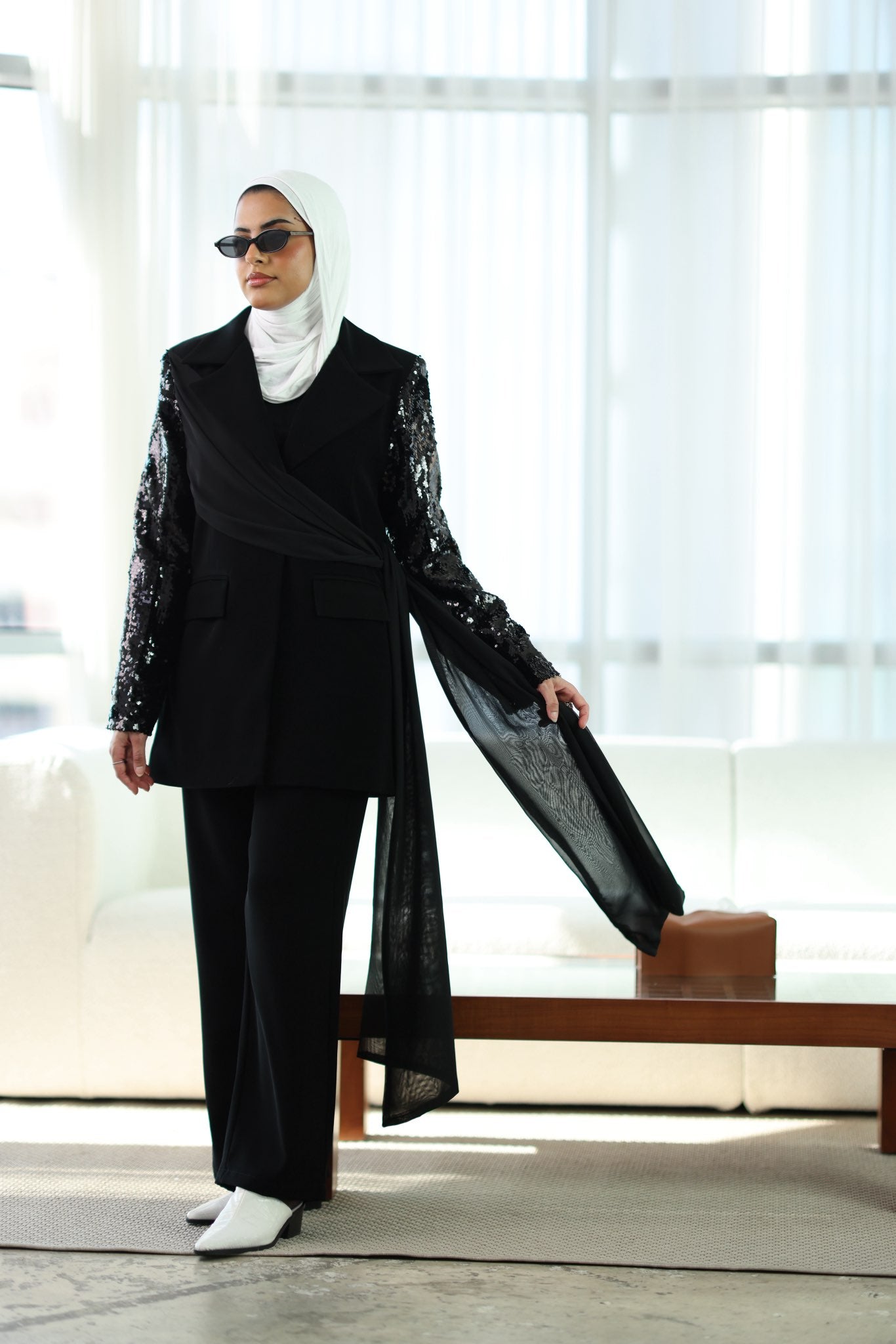 طقم بليزر كريب صيفي بشال مرفق قابل للارتداء بأكثر من طريقة، مع بنطلون متناسق لإطلالة أنيقة ومتجددة.