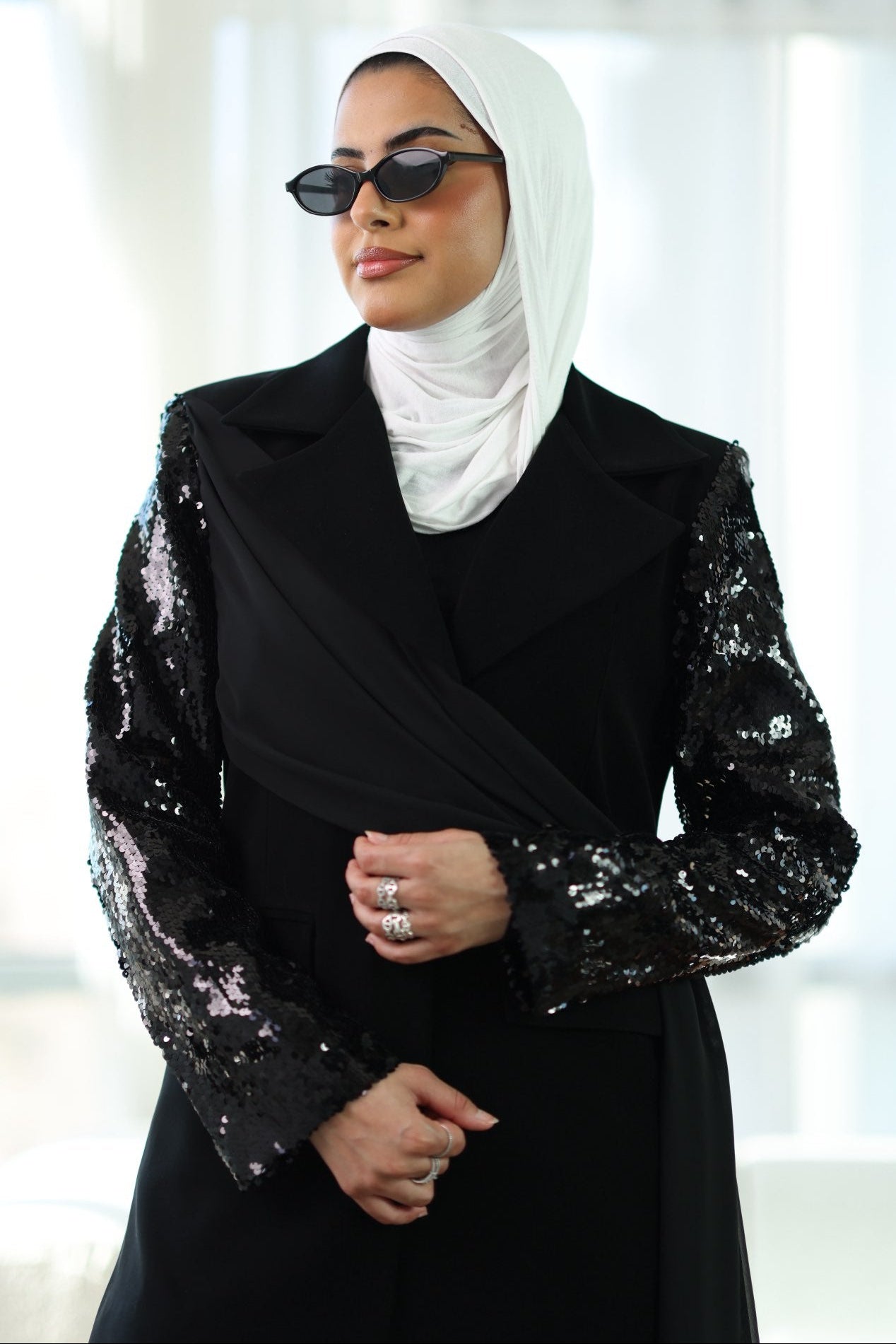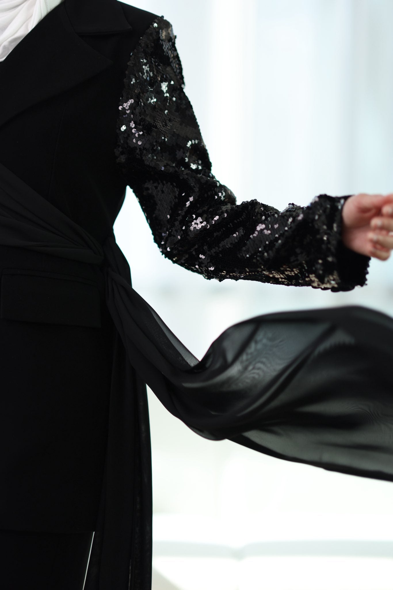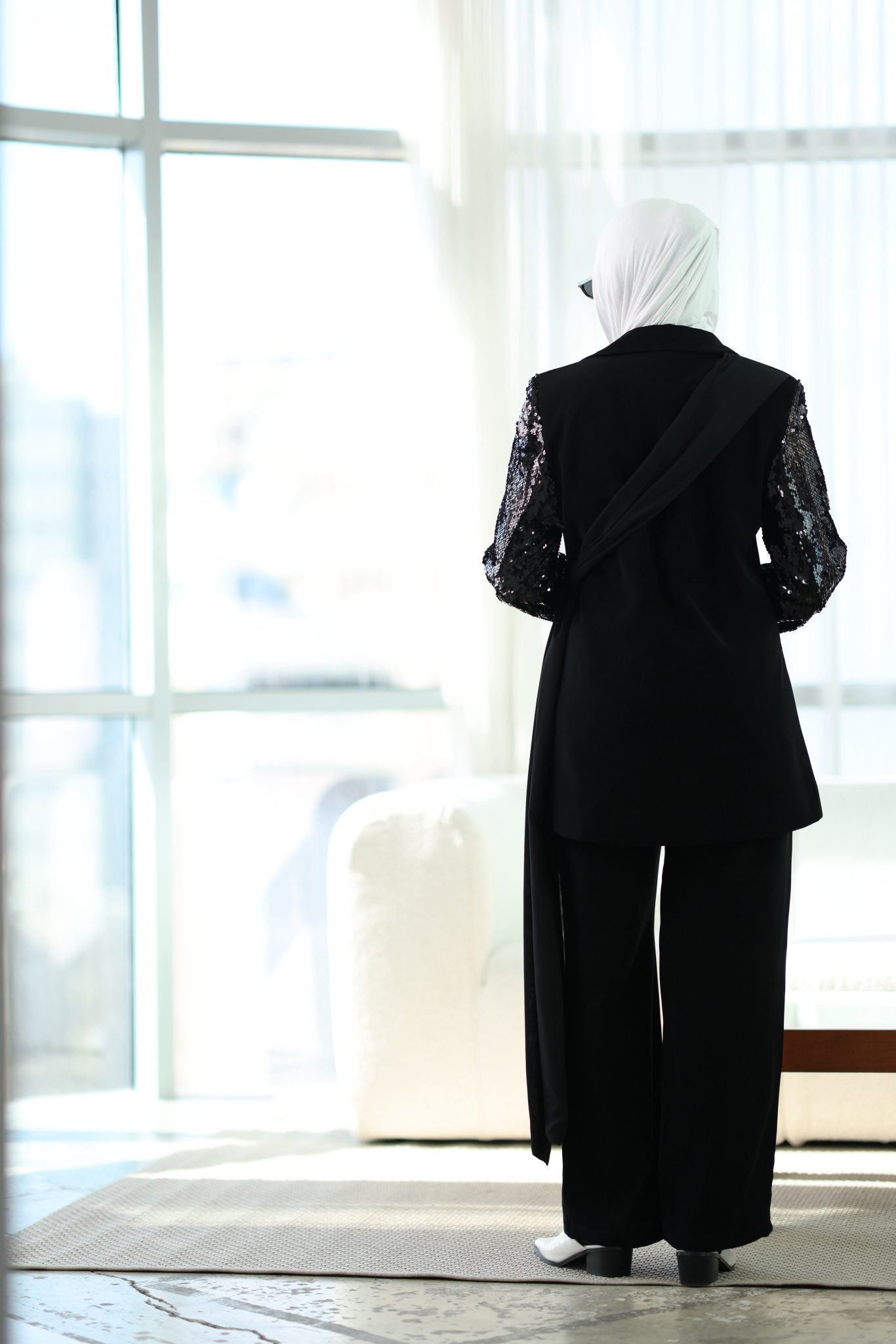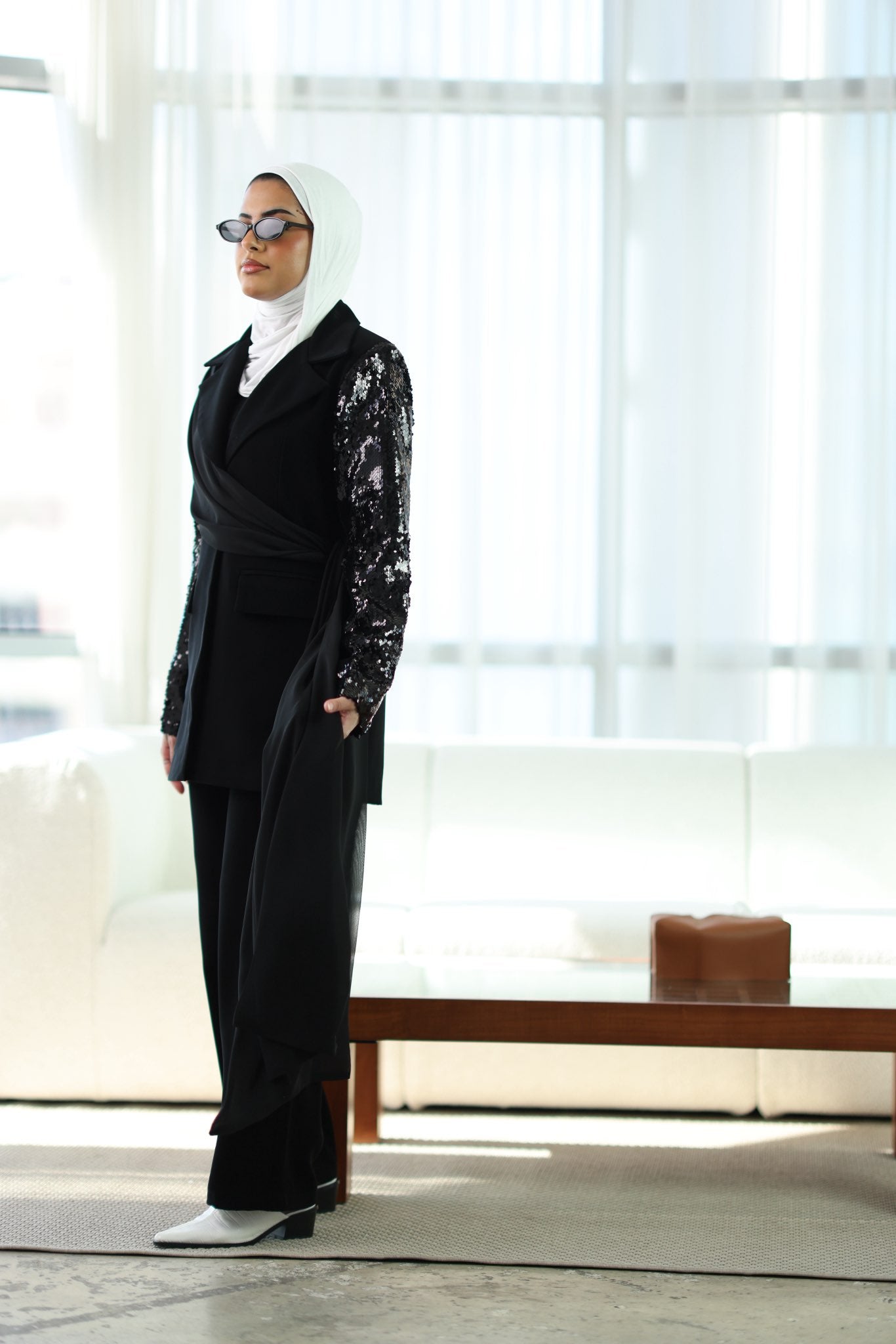 طقم بليزر كريب صيفي بشال مرفق قابل للارتداء بأكثر من طريقة، مع بنطلون متناسق لإطلالة أنيقة ومتجددة.