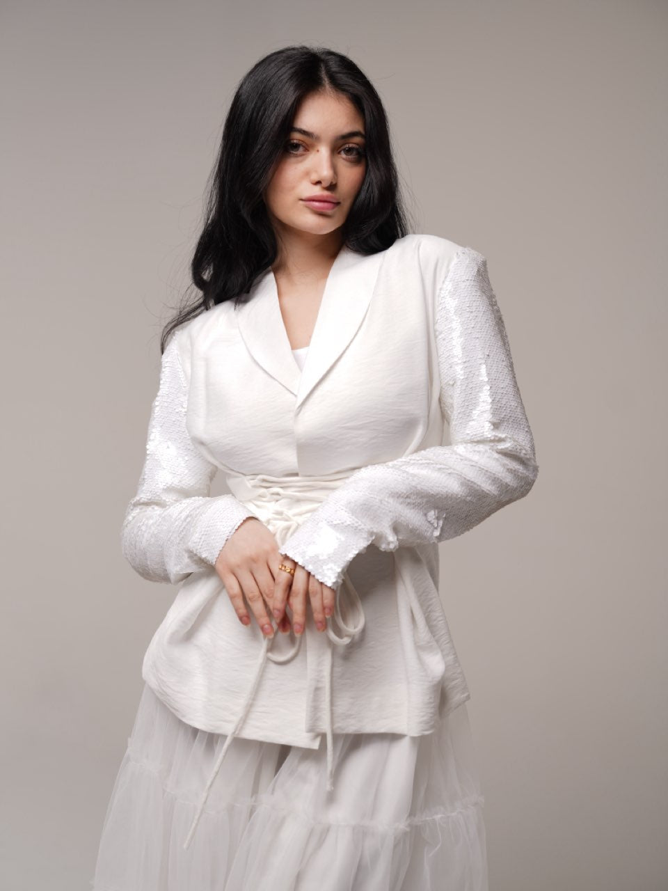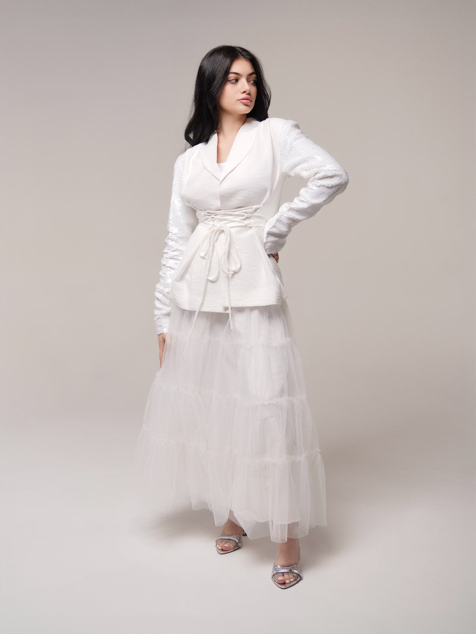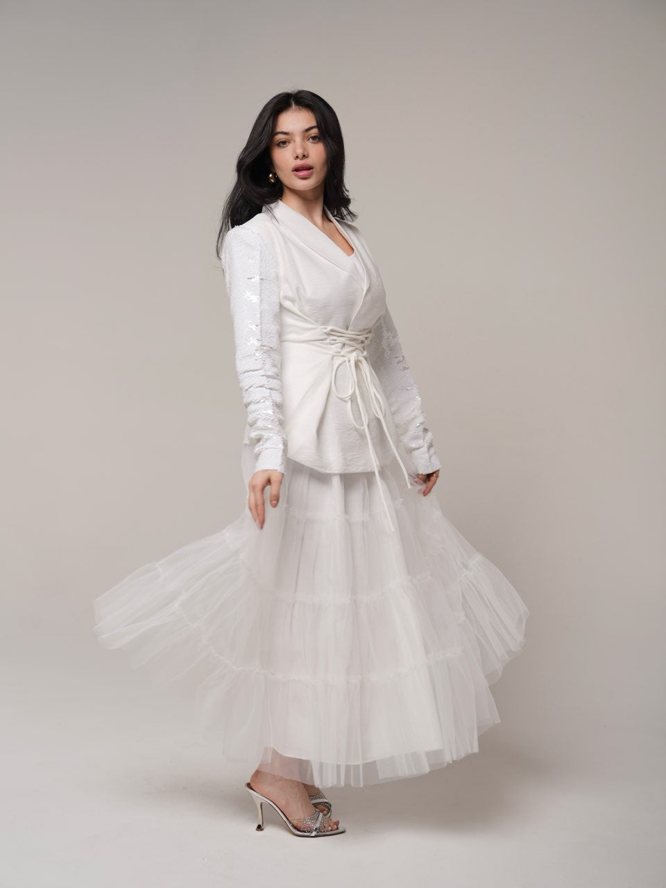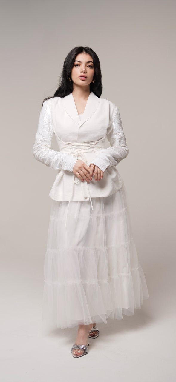 بدلة بلون أبيض فاخرة مكوّنة من جاكيت بأكمام ترتر أنيقة مع تنورة تور ناعمة.
